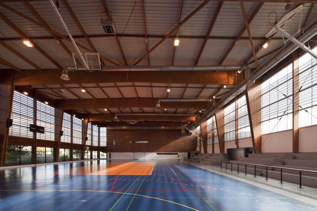 Pour poursuivre cette ambiance chaleureuse et ouverte, nous avons eu recours au bois et au verre. Le gymnase propose ainsi de grandes ouvertures vitrées et traversantes, assurant le dialogue avec l’extérieur et les deux autres bâtiments, qui ont depuis fait l’objet d’une seconde restructuration.