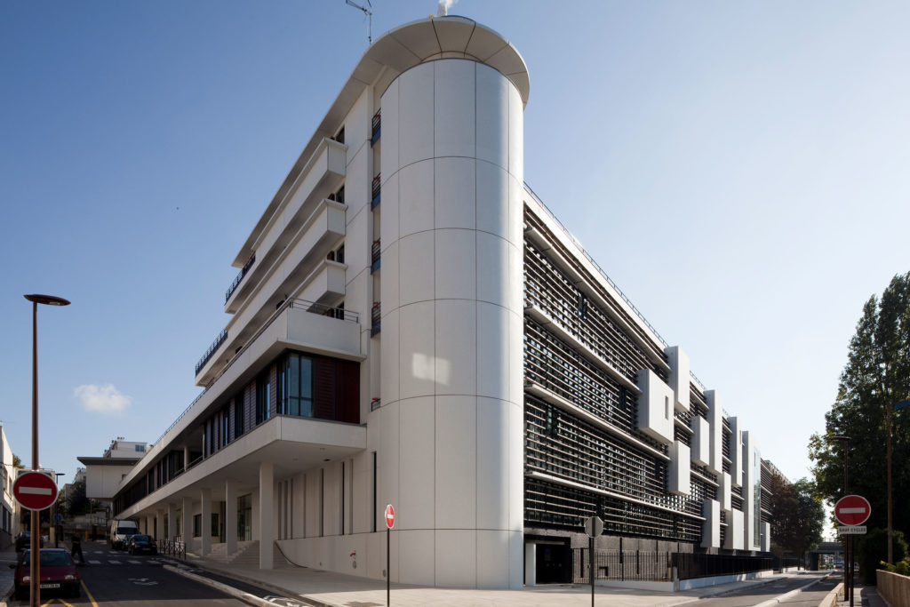 Comment sur une parcelle désaffectée, polluée et bruyante, décliner l’un des premiers bâtiments HQE d’Île de France ? Le projet se présente comme un « bouclier » se défendant du bruit. La paroi externe est ceinte sur deux côtés par une enveloppe vitrée double peau, véritable protection acoustique permettant de circuler dans le bâtiment, de profiter des vues et de la lumière naturelle. Le bruit se voit mais ne s’entend pas. L’esprit s’échappe, le paysage de routes et de rails invite au voyage. La composition offre un traitement graphique et épuré des volumes. Un système de boîtes en béton blanc poli en façades permet de rythmer les lignes tout en empêchant la pollution de se fixer. Le projet s’est avéré également très innovant en proposant une isolation thermique optimale grâce à la construction d’un puits canadien, le plus grand de France à l’époque. Il apporte ainsi une réponse économe en énergie et conforme aux attentes d’un public scolaire, notamment en termes de protection acoustique, de sérénité et de luminosité.